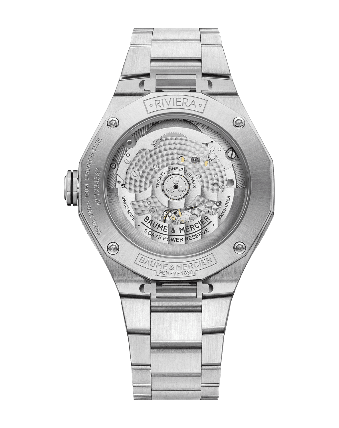 Denne modellen har en urkasse på 39 mm og kommer med en stållenke. Uret har en grå urskive i safirglass med innsin til urverket. Klokken har safirglass og er vanntett til 100 meter. I denne modellen sitter det et Baumatic urverket, som har en gangreserve på 120 timer.