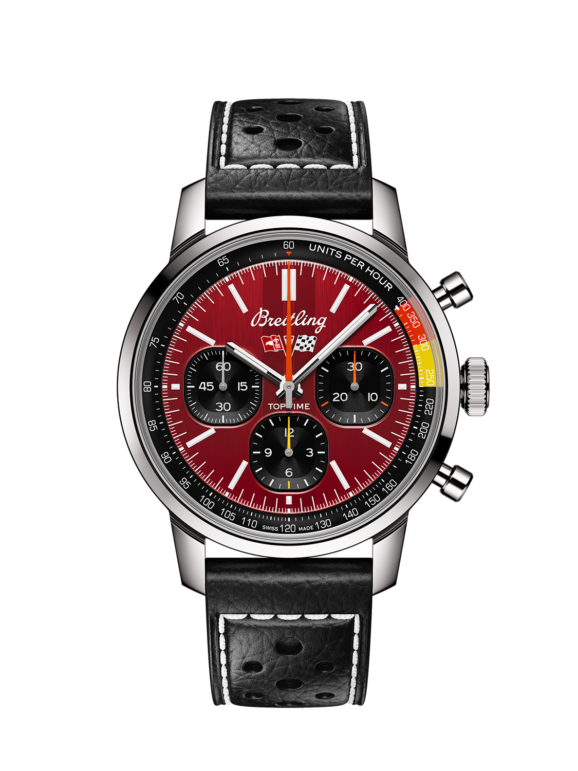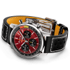 Denne kronograf modellen har en urkasse på 41 mm og kommer med en sort racing kalveskinns rem med folding clasp. Uret har en rød urskive med tachymeter skala rundt urskiven. Klokken har safirglass og er vanntett til 100 meter. I denne modellen sitter det et inhouse urverk fra Breitling, B01 urverket. Dette urverket har en gangreserve på 70 timer.