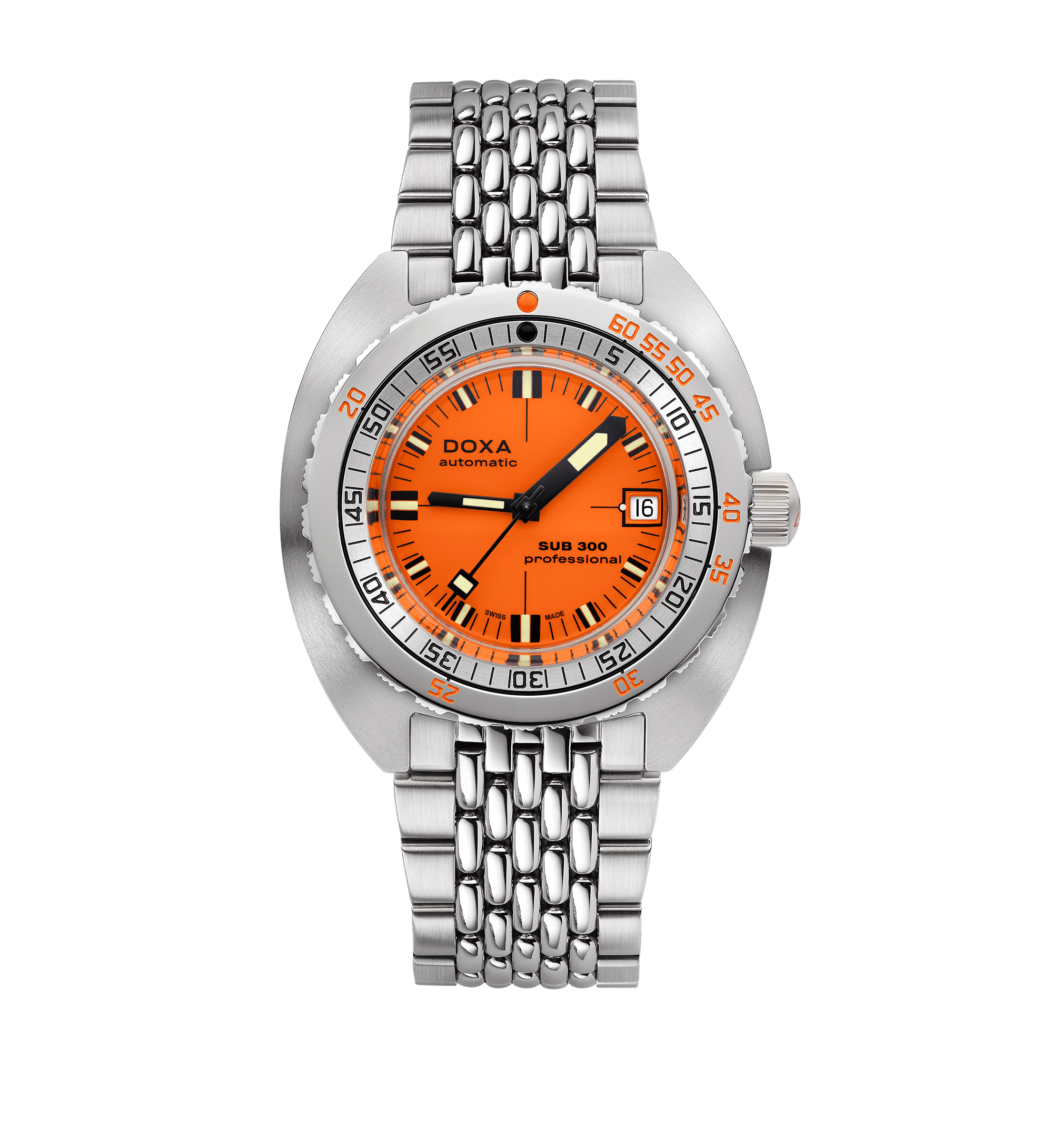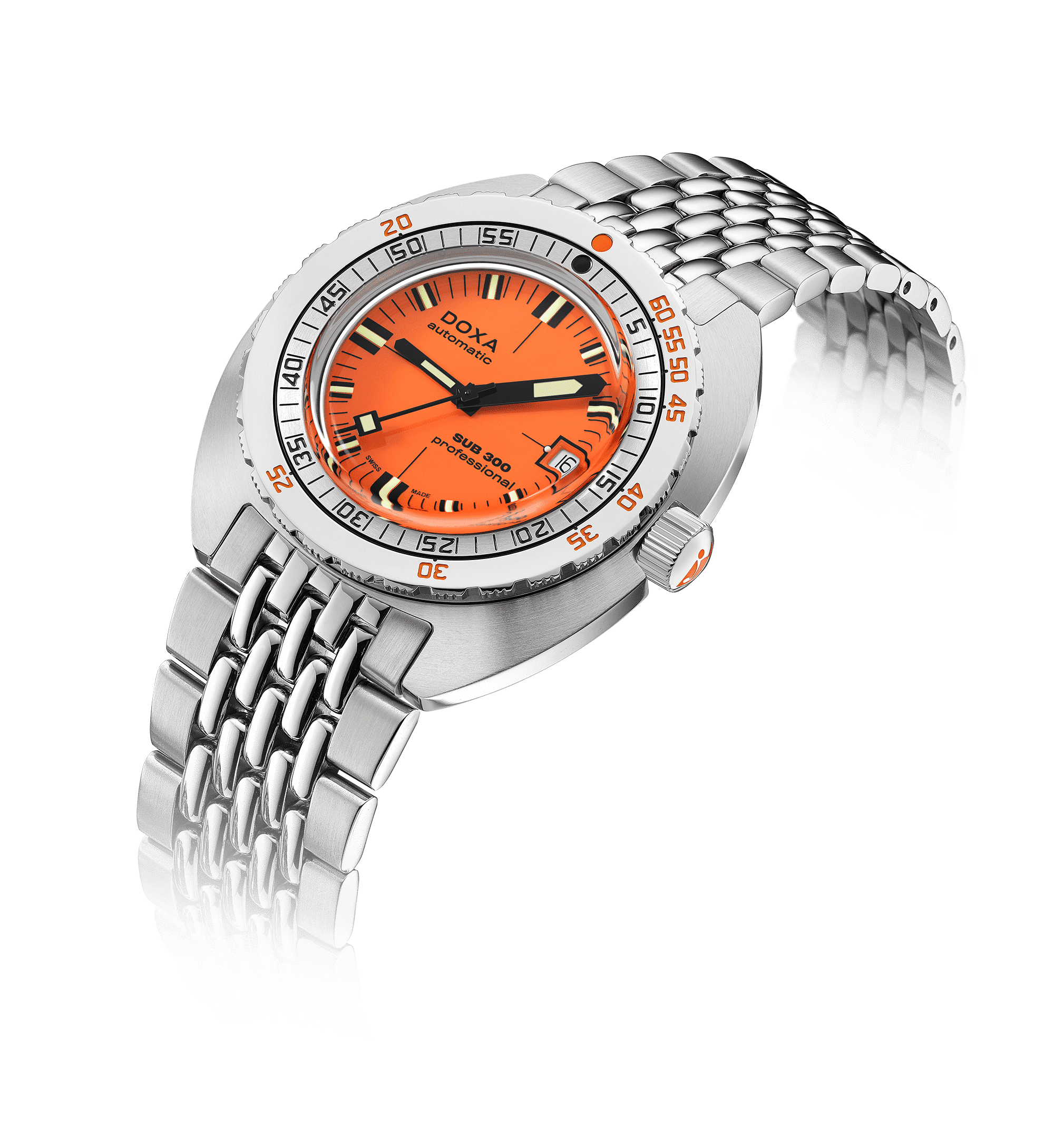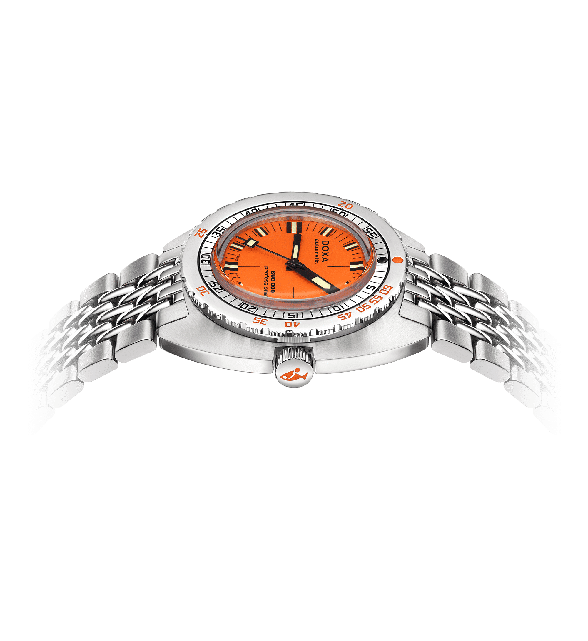 DOXA SUB 300 PROFESSIONAL COSC – 821.10.351.10 er en ikonisk dykkerklokke som forener klassisk design med moderne teknologi, laget for både profesjonelle og entusiastiske dykkere. Denne klokken har en solid 42 mm urkasse i rustfritt stål og er utstyrt med en skrukrone som sikrer en vanntetthet på opptil 300 meter.