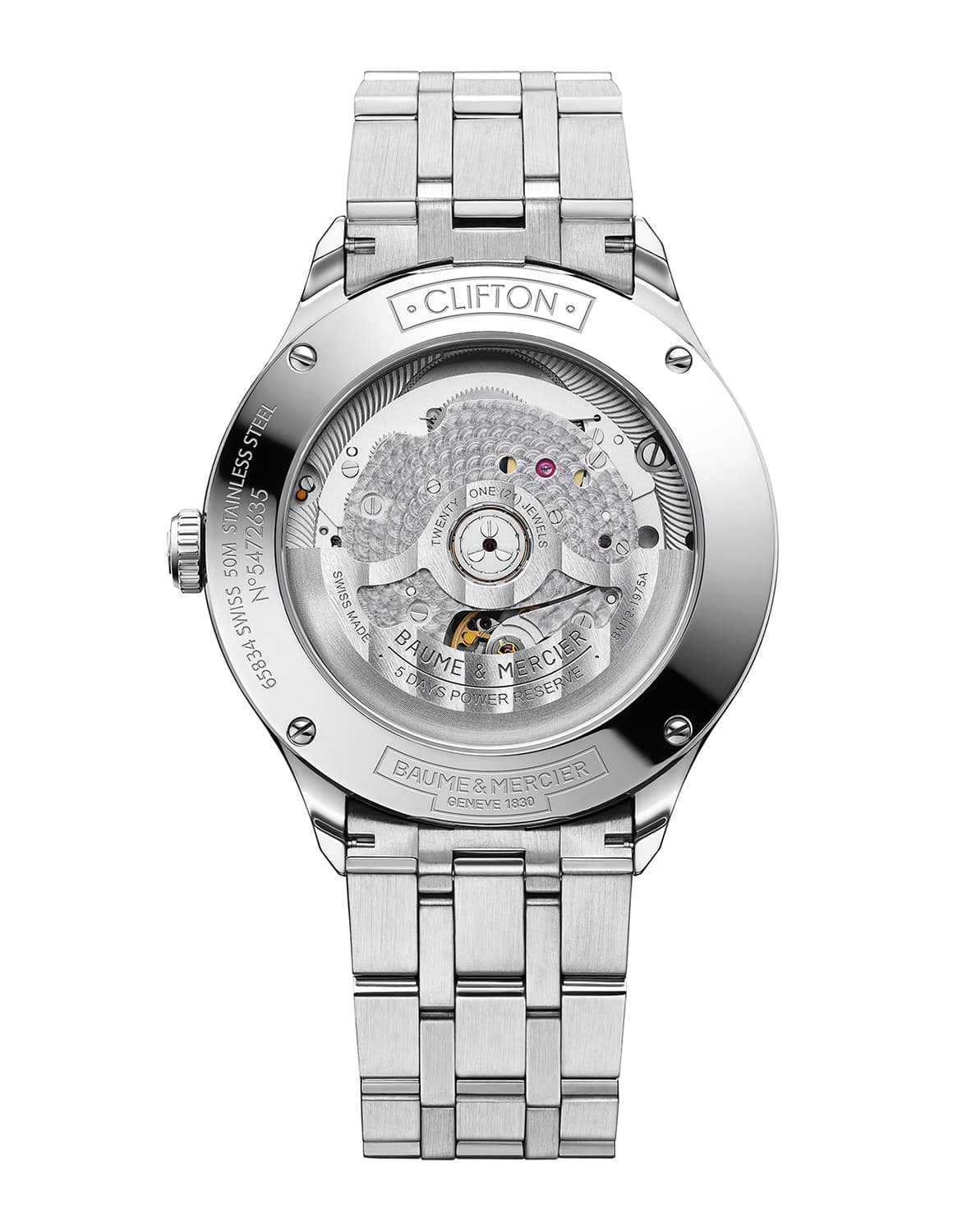 Denne modellen har en urkasse på 40 mm og kommer med en stållenke. Uret har en hvit urskive med datovisning kl 3. Klokken har safirglass og er vanntett til 50 meter. I denne modellen sitter det et Baumatic urverk som er COSC – sertifisert. Urverket har en gangreserve på 120 timer.